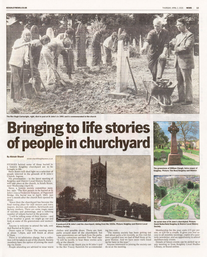 The April meeting of the Keighley and District Local History Society’s is next Wednesday evening (8th April 2026). In a change from the usual venue, we will be meeting at St. John’s Church in Ingrow. History Society committee member Steve Bown will be giving his talk ‘Buried at St. John’s’.