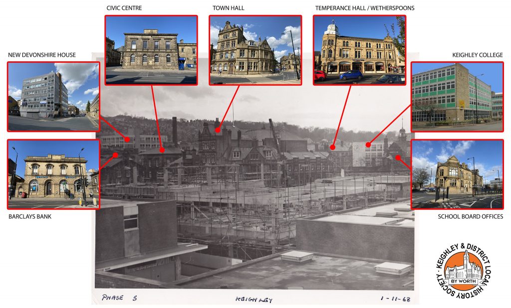 The main black and white photograph was taken near the end of the 1960s transformation of Keighley town centre on 1st November 1969. It was taken by Robert Long as part of a project to record progress on the restructuring.
