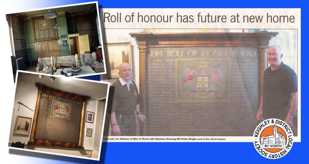 When the building that housed the Lodge was being converted to flats, the Men of Worth Project stepped in and arranged for the Roll of Honour to be relocated to The Wyedean Weaving Co. Ltd., Bridgehouse Mill, Haworth. The new home was unveiled to the public in November 2018.