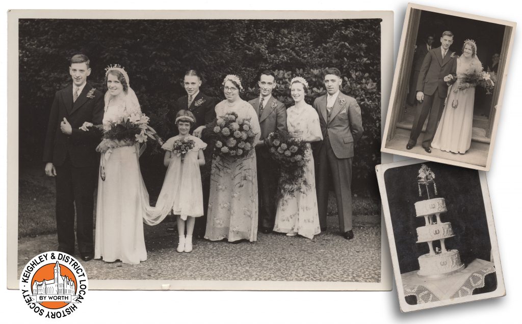 The wedding was photographed by Keighley photographer George A. Shore. Shore was a popular Keighley-based freelance photographer who simultaneously ran his photography business alongside running a carpet and linoleum store in Keighley market. Examples of his work exist from the 1930s and 1940s, and included outdoor events such as Keighley Gala, the coronation of King George VI, Victory street parties at the end of the Second World War, theatre productions, weddings, and landscapes. Many of his photographs were commissioned by and printed in the Keighley News. His original prints could be embossed “G. A. Shore” or stamped on the back in a circle “Geo. A. Shore”. In his other lines of business, Shore was an early member of Keighley Road Club and used to deliver rolls of carpet and linoleum via his motorbike and sidecar, aided by assistant Sam Scaife. Shore died in 1946.