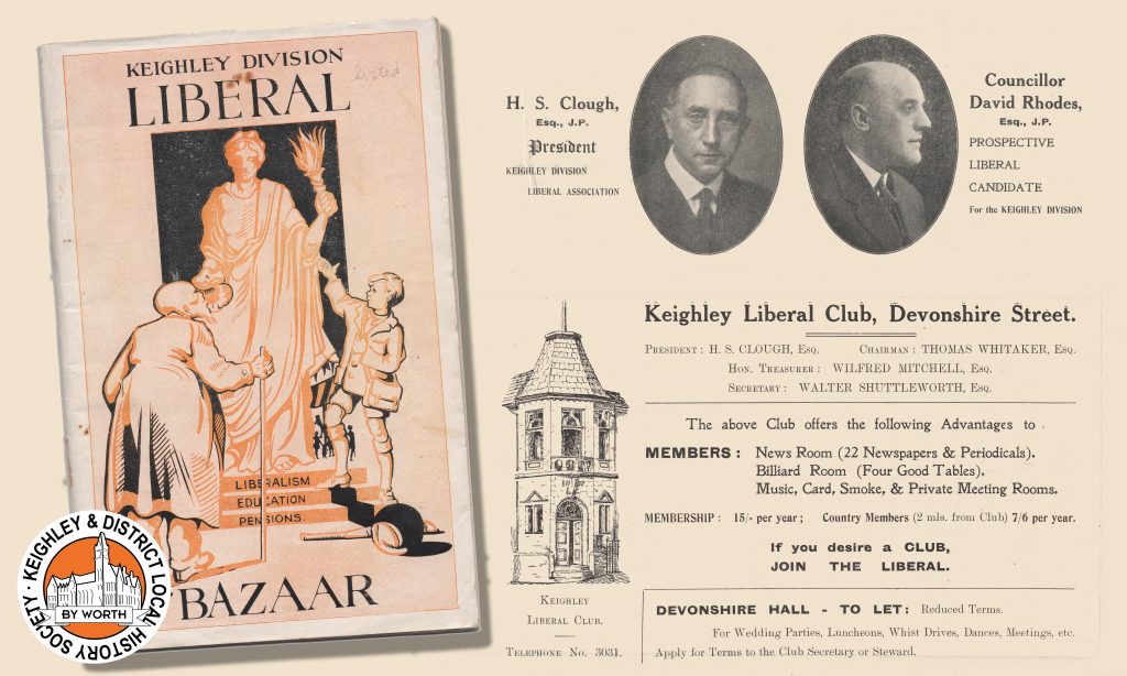 The Keighley Division of the Liberal Association held a Bazaar in the Municipal Hall (Mechanics’ Institute) from Wednesday 17th to Saturday 20th October 1928. The purposes of the Bazaar were “1. To free the Association from debt, 2. To provide the means of conducting Active Political Work throughout the (Keighley) Division, 3. To combine the workers throughout the Division in one common object for the benefit of the Party”.