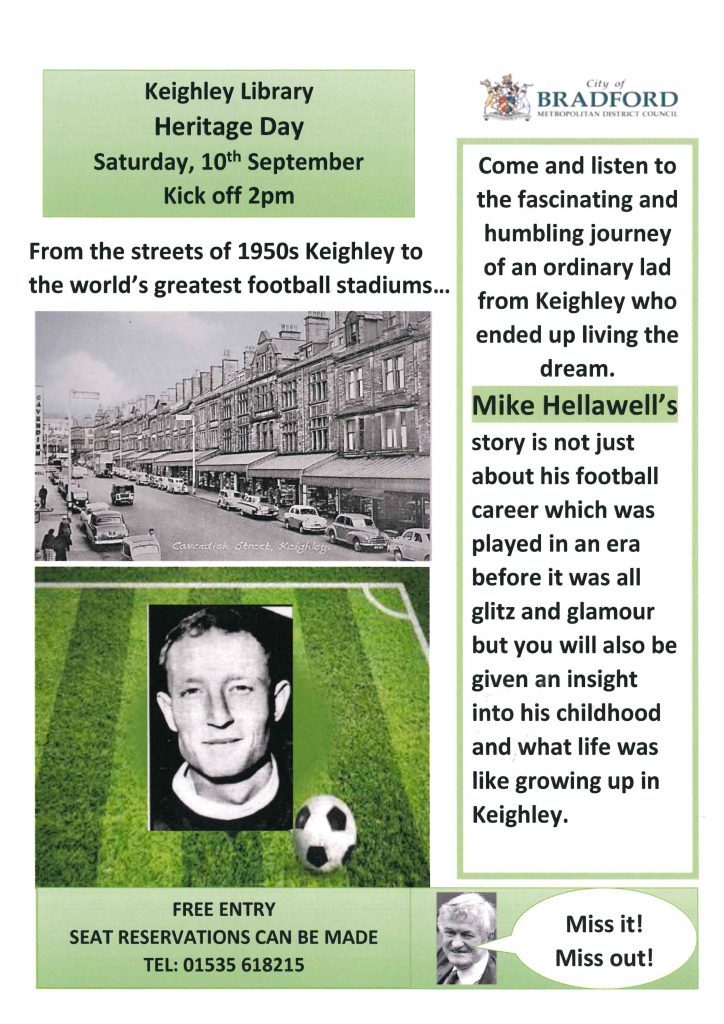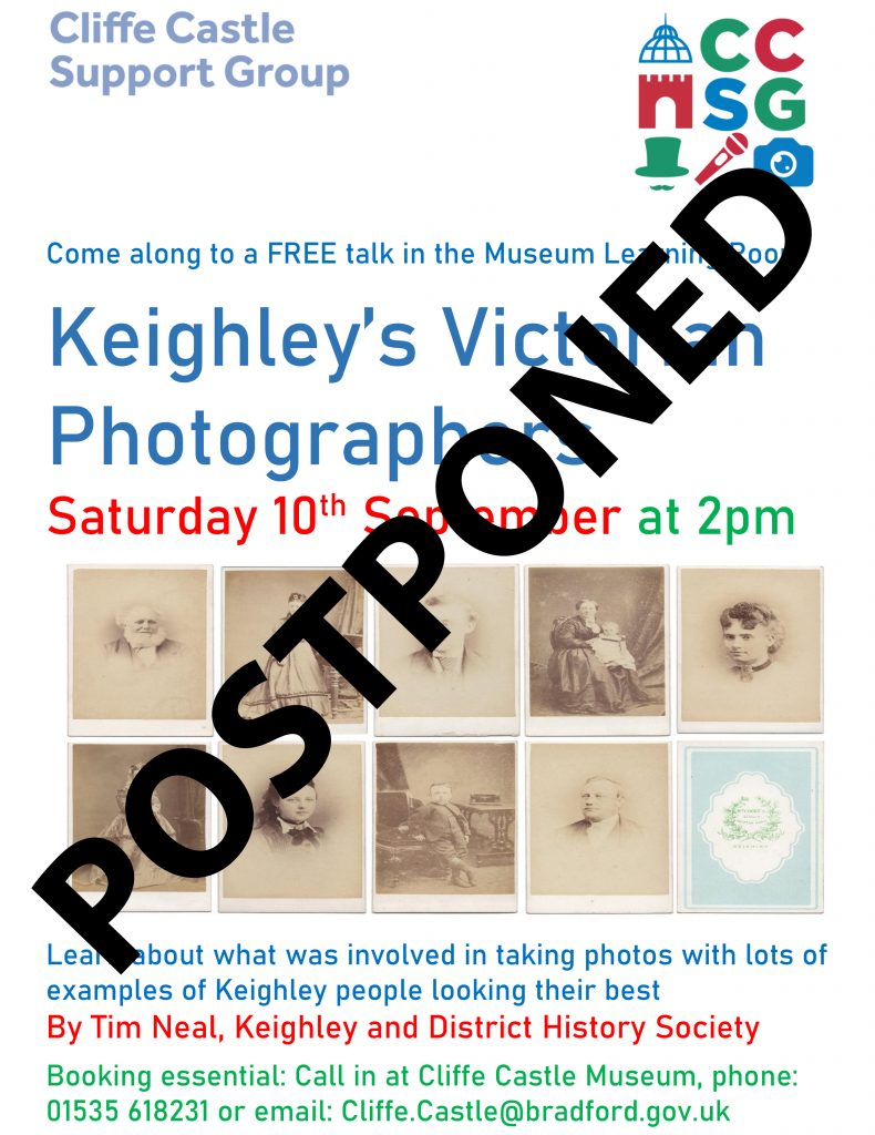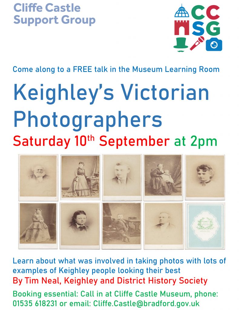 There are two very different talks happening this coming Saturday (10th September). History Society member Tim Neal is giving a talk on Keighley’s Victorian Studio Photographers at Cliffe Castle at 2pm and Mike Hellawell will be giving a talk on his football career and on growing up in Keighley in the 1950s at Keighley Library at 2pm.
