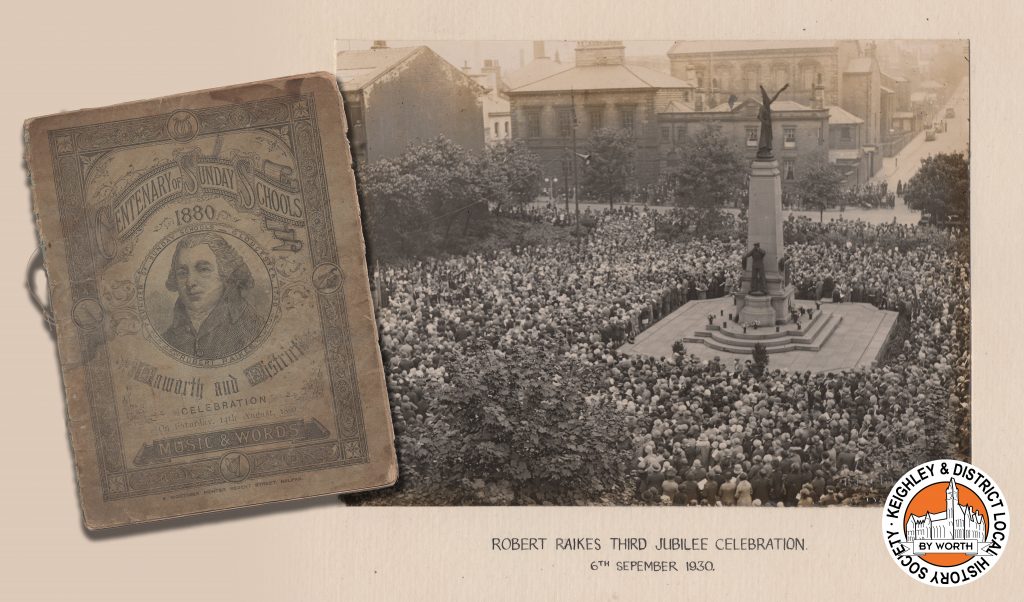 Also shown is the front cover of a booklet containing hymns and music to be sung at the Haworth and District Celebration of the Sunday School Centenary, to be held at Marsh Bottom, Haworth, on Saturday 14th August 1880. The beautifully designed cover includes a portrait of Robert Raikes.