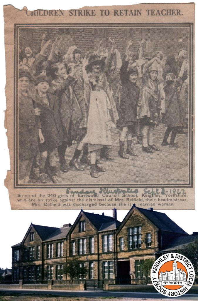 This newspaper clipping is from an edition of Sunday Illustrated, published on the 3rd of September 1922. The headline and caption reads: “Children strike to retain teacher: Some of the 240 girls of Eastwood Council School, Keighley, Yorkshire, who are on strike against the dismissal of Mrs Belfield, their headmistress. Mrs Belfield was discharged because she is a married woman.”