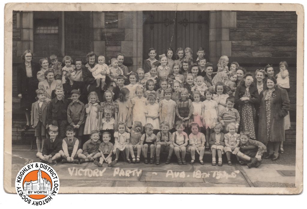 Children and mothers assembled on the steps of Lund Park Methodist Chapel Sunday School on Malsis Road. The occasion was a Victory Party following the end of war in Europe, held on 18th August 1945. The photograph was one of many taken by local photographer George Shore (the postcard-sized photograph is stamped on the back). Shore went around recording the many street parties that took place and then made the photographs available for people to buy as a record of the occasion.